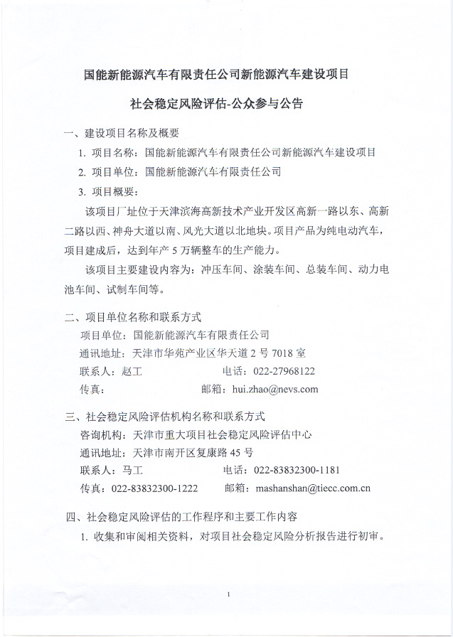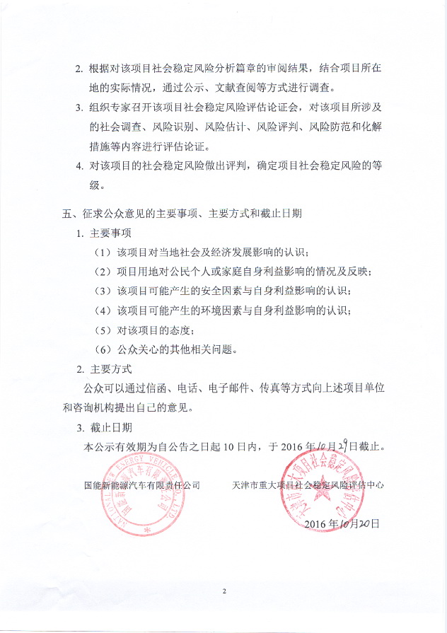 公众参与公告:国能新能源汽车有限责任公司新能源汽车建设项目社会稳定风险评估