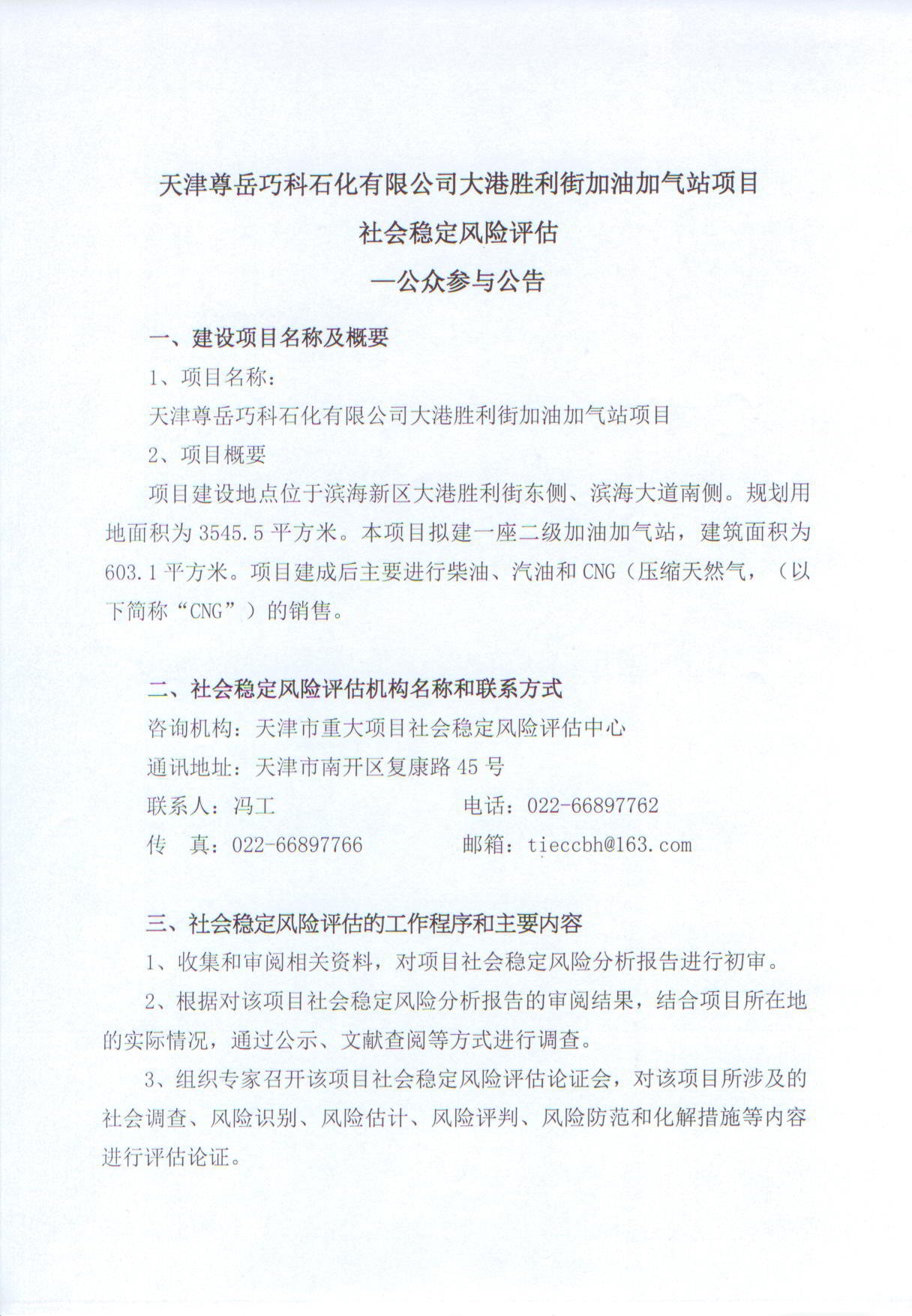 公众参与公告:天津尊岳巧科石化有限公司大港胜利街加油加气站项目社会稳定风险评估