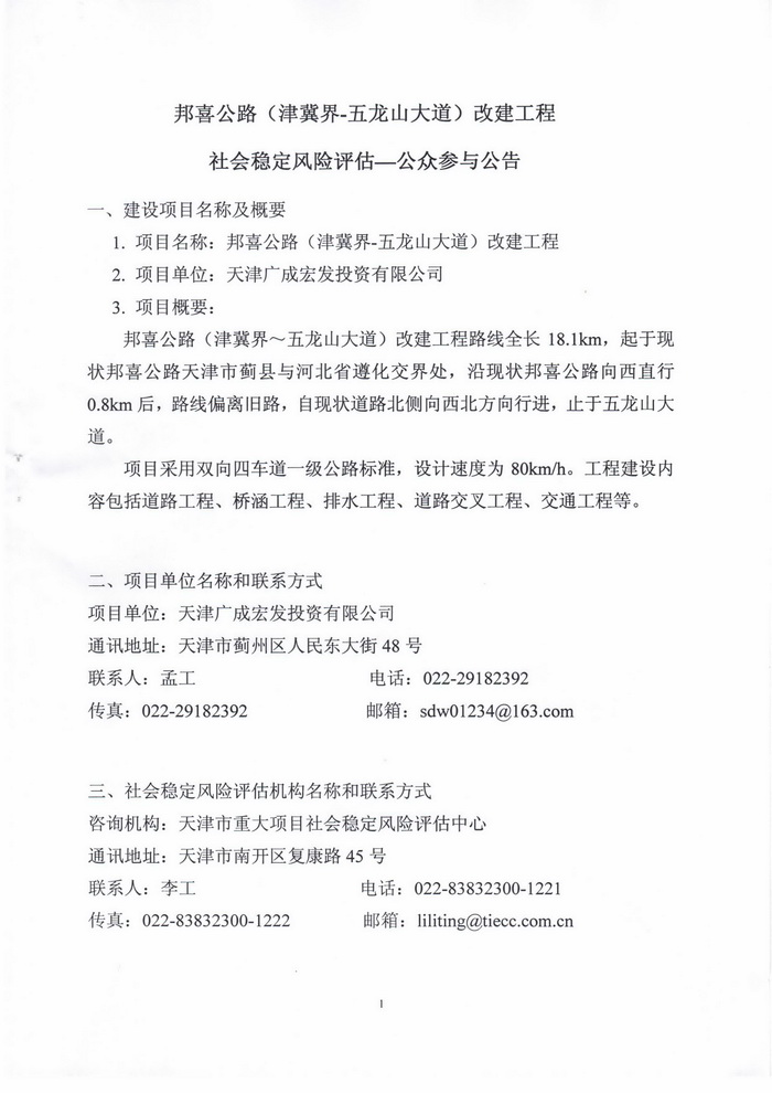 公众参与公告:邦喜公路(津冀界-五龙山大道)改建工程社会稳定风险评估